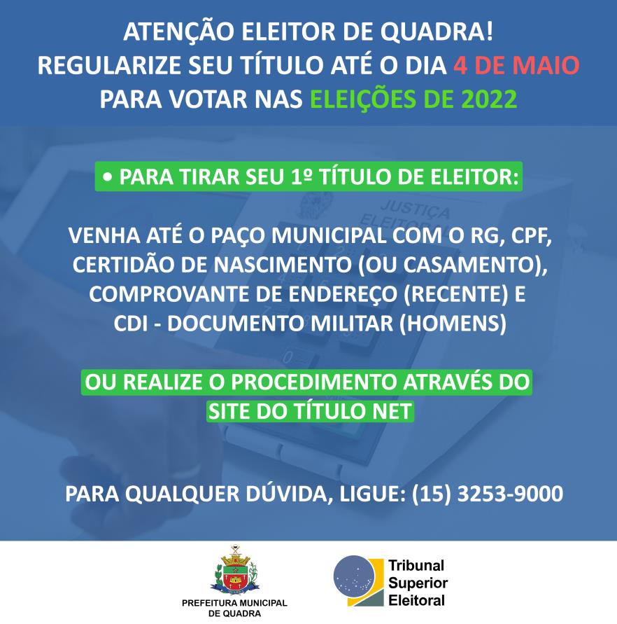 ATENÇÃO ELEITOR DE QUADRA! REGULARIZE SEU TÍTULO ATÉ O DIA 4 DE MAIO PARA VOTAR NAS ELEIÇÕES DE