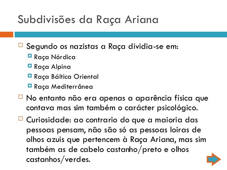 A raça ariana para os nazistas, eram ''brancos'' de um bom porte físico, em sua maioria loiros e de olhos azuis. Pros nazistas os arianos eram os mais inteligentes, mais altos, mais belos e mais superiores.