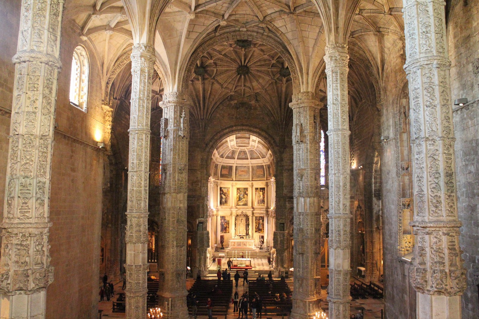 Igreja de Santa Maria de Belém. Ao passar pela porta principal e entrar na Igreja de Santa Maria de Belém, você terá a sensação de ter entrado numa gruta. O teto da Igreja tem nervuras que se multiplicam pelo teto. As junções das nervuras tem peças circulares com símbolos do estilo manuelino, o estilo arquitetônico usado no Mosteiro.