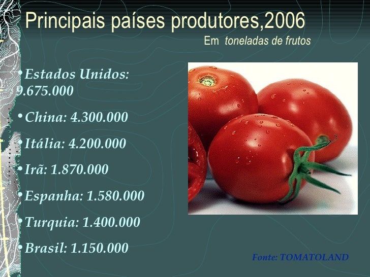 Brasil é atualmente o 9° maior produtor de tomate do mundo. Segundo dados da FAO, enquanto na Eu-ropa e nos Estados Unidos o crescimento médio foi de 30% e 45%, respectivamente, a produção brasilei-ra de tomate quase duplicou em 20 anos. A posição do País foi conquistada devido ao aumento de produtividade. Atualmente, o Brasil ocupa o 3°