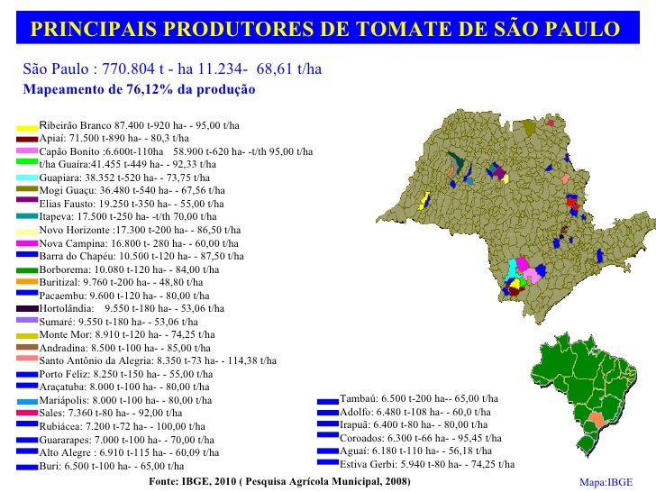 Os 10 municípios que mais produzem Tomate no Brasil. (em toneladas) Cristalina - GO. 350.000. Morrinhos - GO. 185.000. Itapeva - SP. 132.500. Miguelópolis - SP. 90.000. Piracanjuba - GO. 85.600. Vianópolis - GO. 68.367. Ribeirão Branco - SP. 66.240. Mucugê - BA. 65.550. Guaraciaba do Norte - CE. 59.250. Guaíra - SP. 54.000.