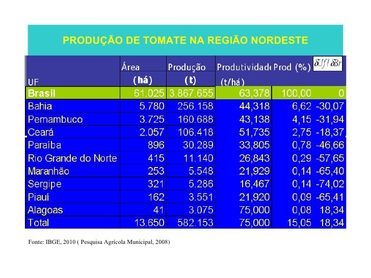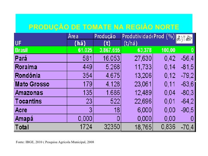 Segundo dados do censo agropecuário do Instituto Brasileiro de Geografia e Estatística ( IBGE ), a produção comercial de tomate está distribuída em 24 unidades da Federação, com estoque nacional estimado em 3,7 milhões de toneladas. O Paraná é, ao lado da Bahia, o quarto principal fornecedor de tomate, respondendo por 6% do mercado.