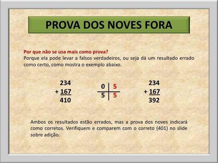A regra do noves fora (ou prova dos nove) Quando as calculadoras ainda não eram populares, os contabilistas utilizavam um truque para verificar se suas contas estavam corretas: a conhecida prova dos noves ou do "noves fora". Trata-se de um teste de validade para o cálculo manual de somas, subtrações, divisões e multiplicações de números.