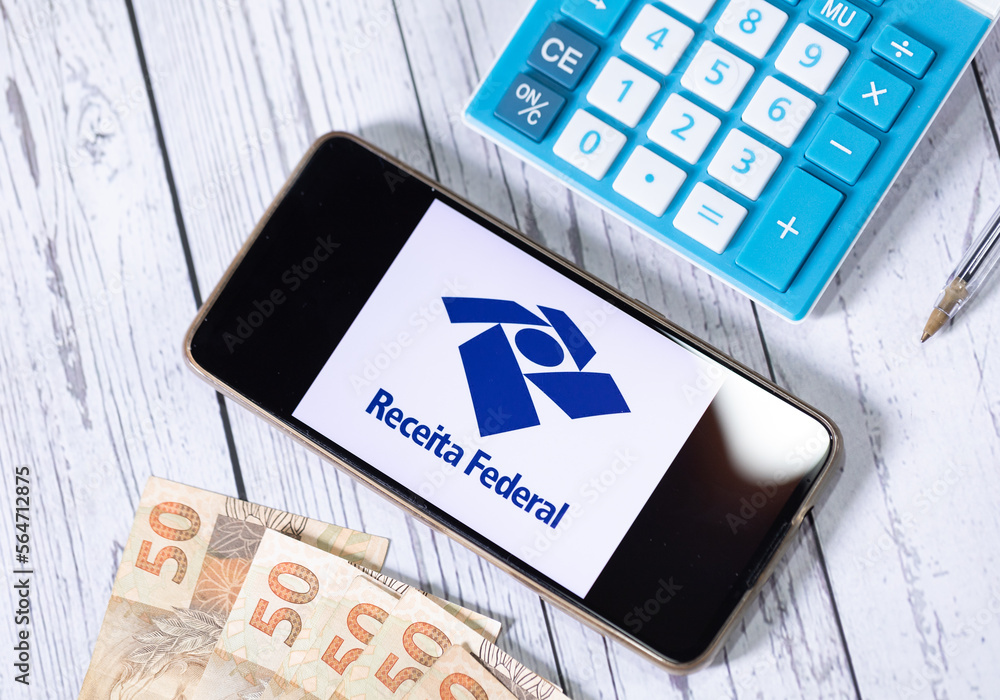 RFB Receita Federal. Um telefone celular com a logo da Receita Federal do Brasil e uma
